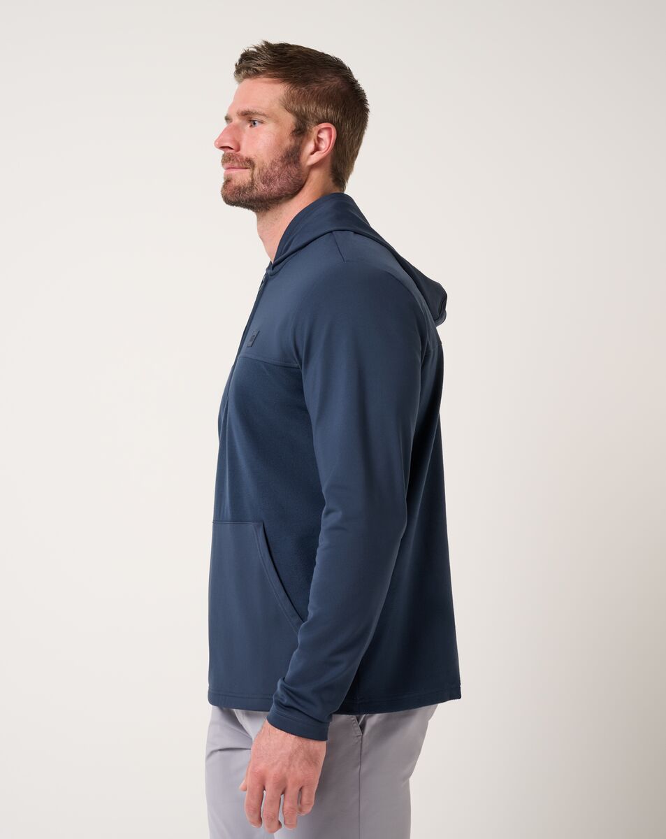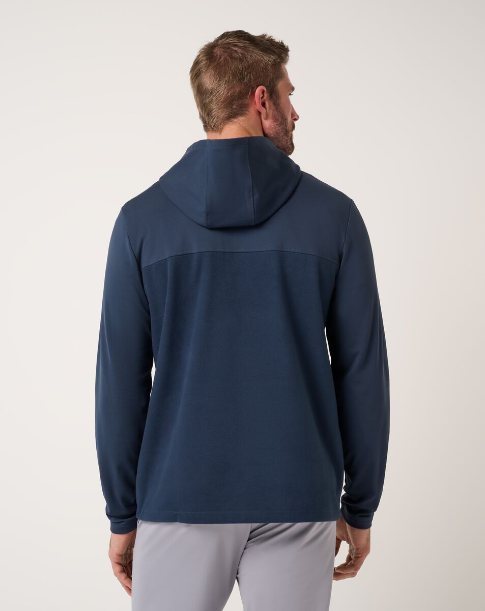 POLAR SEAS hooded quarter-zip is the layer you reach for when the air turns sharp and the plans are still unfolding. Dual-sided brushed Peak Fleece gives it depth, warmth, and that broken-in feel from the first pull on. Clean lines, subtle texture, and a quiet logo on the chest keep it understated, but never forgettable.